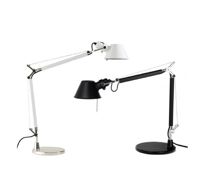 Artemide propose Tolomeo dans différentes tailles et différents coloris: comme lampe de bureau sur pied ou à pince ou bien en version murale avec le corps de la lampe de bureau. Tous ces modèles existent respectivement en alu-gris, blanc brillant et noir, ainsi que dans une version raffinée avec une superbe tête chromée.