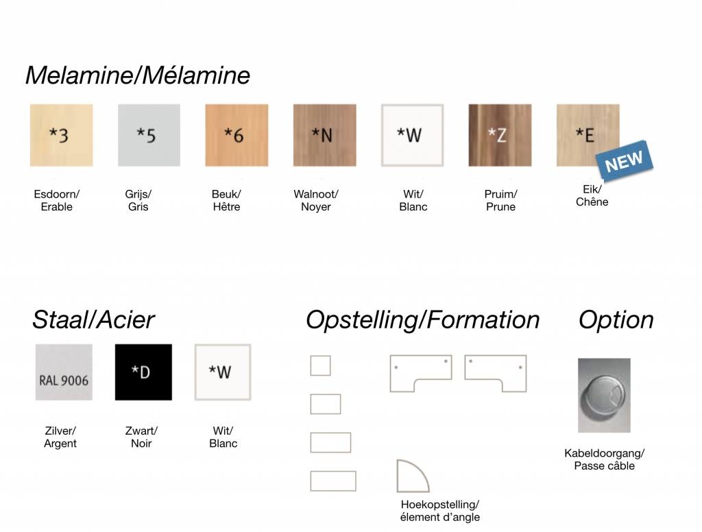 Bureau Officina, réglable en hauteur met du mouvement dans les bureaux: les bureaus Officina à hauteur réglable. Officina mobilier de bureau apporte la solution à toutes les situations qui peuvent se présenter dans le monde du travail. Les nombreuses tailles de tables, le bureau en angle de forme originale et l’élément en coin permettent de composer des postes de travail entièrement personnalisés. Côté ergonomie, les bureaux Officina sont aussi à la pointe de leur époque! La table est en effet réglables en hauteur manuellement entre 65-85cm. Les plateaux en particules E1 possèdent un revêtement mélaminé en sept coloris. Les châssis en acier de la série Officina sont fabriqués en exclusivité pour Brand New Office dans une version poudrée blanche, noir et aluminium. Les plateaux en particules E1 possèdent un revêtement mélaminé en sept coloris. Réglage en hauteur électrique d’une simple pression de touche: bureaux Officina de Brand New Office. Les bureaux réglables en hauteur Officina de Brand New Office se distinguent en outre par un rapport qualité/prix exceptionnel. Le support pour unité centrale et la chaîne porte-câbles verticale gèrent efficacement votre équipement informatique. A partir de € 750 valeur de marchandises la livraison est gratuite. Dès 1500€ de commande (valeur nette), le montage est inclus et effectué sur place, par notre équipe d’installation, spécialisée en mobilier. Les emballages sont repris et vous êtes assurés d’une bonne installation de vos meubles. Commandez vos bureaux Officina et travailler au sein de 15 jours dans un environnement qui respire la qualité.