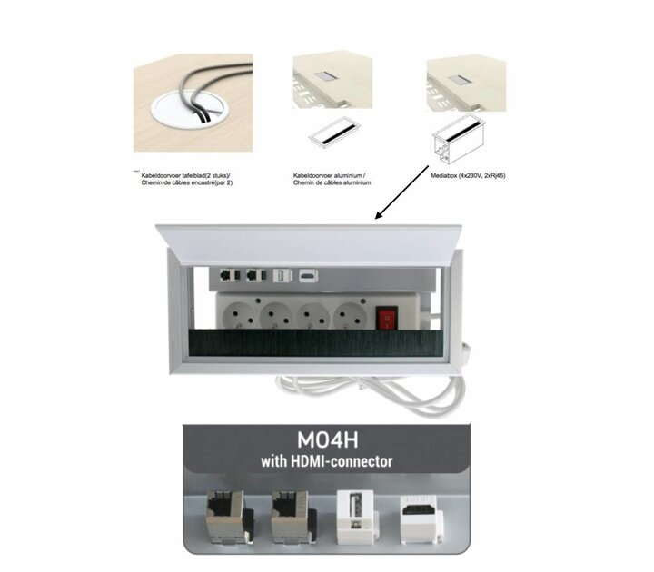Le système de mobilier Ogi-Q de MDD répond aux exigences élevées en termes d’ergonomie: les passes câbles encastrés font en sorte que l'espace de travail soit net et sans encombrements: une entrée de câble ordinaire en aluminium, un presse-étoupe avec la boîte 'Mediabox' ou vous pouvez directemment se connecter avec votre PC. Le plateau du bureau Ogi-Q de Mdd se décline en plusieurs coloris : chêne, wengé, bouleau, blanc, noyer, aluminium, cacao, anthracite et hêtre. Le cadre est en métal blanc, anthracite ou coloris aluminium.