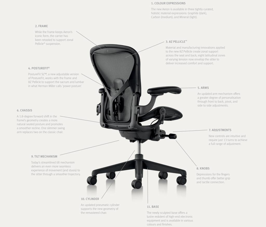 Hij staat niet alleen in de Design Collection van het museum of Modern Art in New York omdat hij er goed uitziet. Hoewel dit al voldoende zou zijn! De Aeron bureaustoel is simpelweg een uiterst moderne bureaustoel. De ontwikkelaars en ontwerpers Don chadwick en Bill Stumpf leverden de Amerikaanse stoelen-specialist Herman Miller een meesterstuk door één van de comfortabelste bureaustoelen ter wereld te ontwerpen.