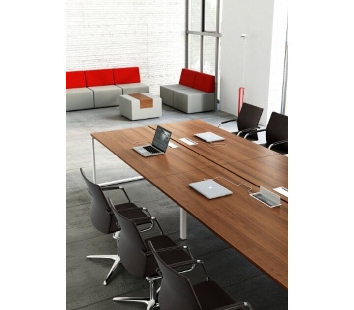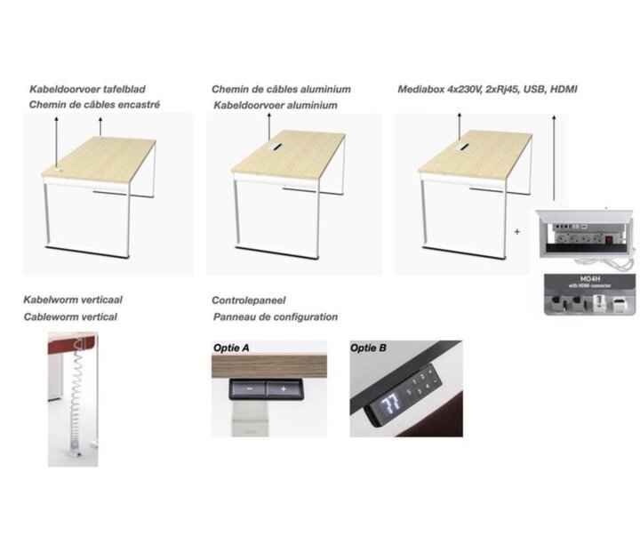 Dit bureau van MDD heeft ook heel wat "Cable management": een gewone kabeldoorvoer in aluminium of een kabeldoorvoer met mediabox die stopcontacten en 'plugin's' heeft. Wel, het Ogi-Q meubelsysteem biedt een oplossing voor elke opstelling.