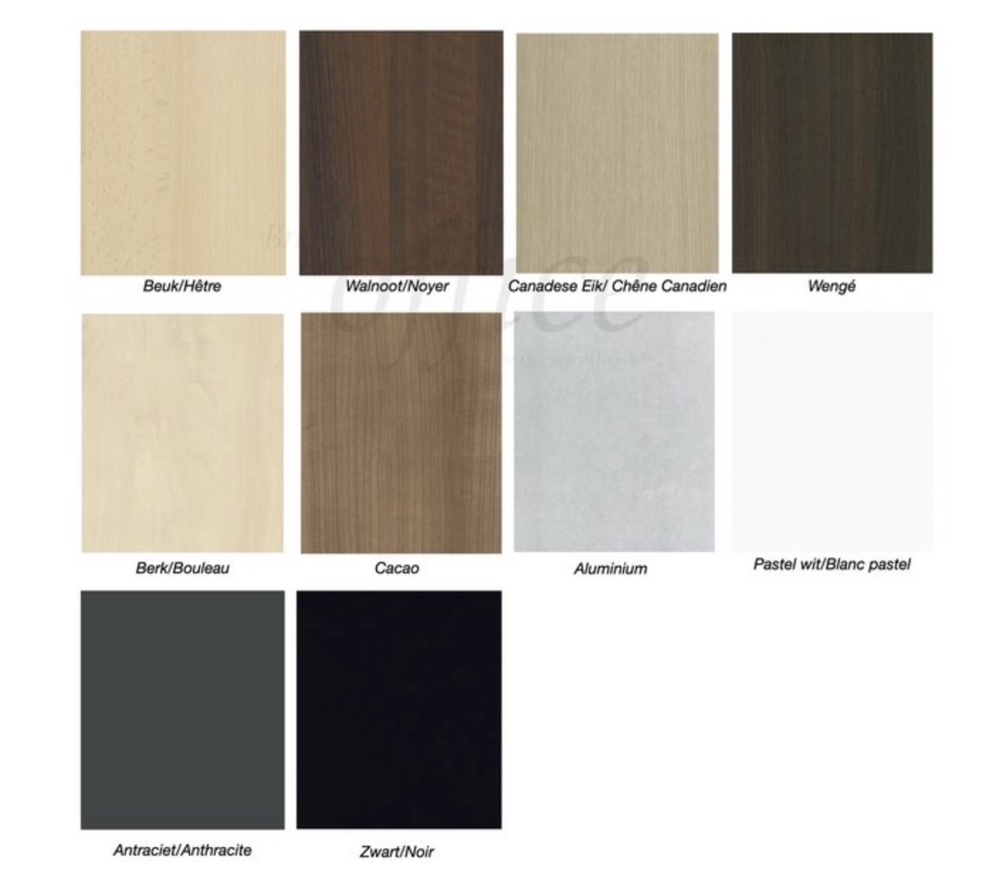 Kleur: eik, wengé, berk, aluminium, walnoot, cacao, eik, antraciet en wit