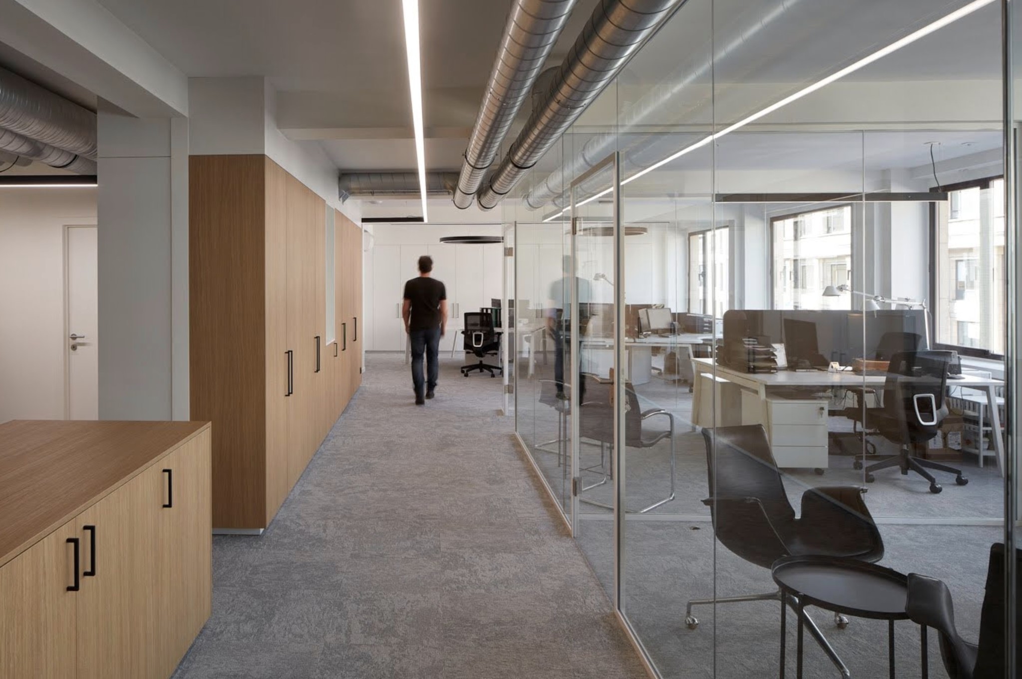 Voor de werkruimte werd geopteerd voor Mdd Ogi M enkel bureau's en bureau- eilanden met BNO Ergo 5 bureaustoelen met extra dik zitkussen.